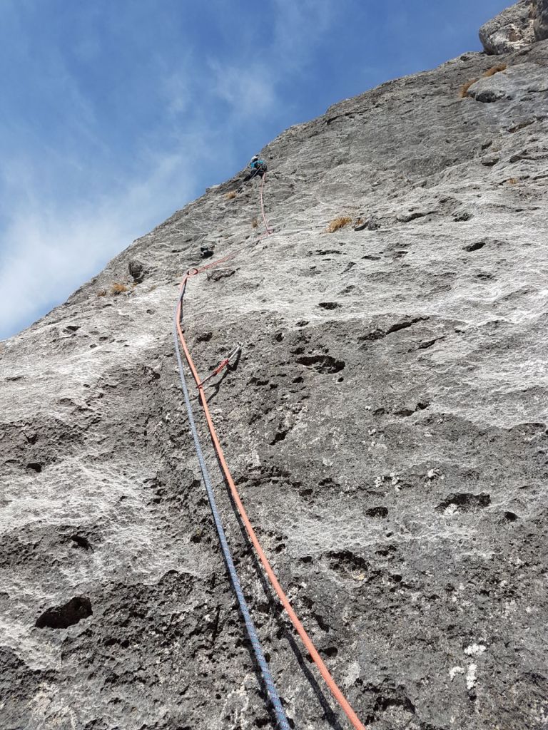 L2: 7A+ 30m. Tiro spettacolare !!! Dopo qualche metro verticale su roccia che richiede un minimo di attenzione (2 fix aggiunto dallโaltoโฆ) si raggiunge una fessura che porta verso destra. Si abbandona la fessura dopo qualche metro con enigmatico passo di equilibrio verso sx. Continuitร su buchi per alcuni metri e finale piรน facile ma con chiodatura piรน distanziata. In uscita tenere la dx per arrivare in catena. Sosta scomoda su due fix da collegare.