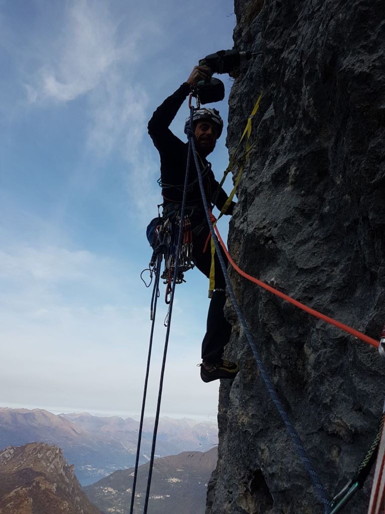 Quasi alla conclusione del terzo tiro appeso ad un fix prima di ripartire subito dopo aver chiodato, mi staccai la corda di servizio del trapano dallโimbrago, per calarla al mio partner in sosta per farmi attaccare i โfix lunghiโ per la sosta successivaโฆ