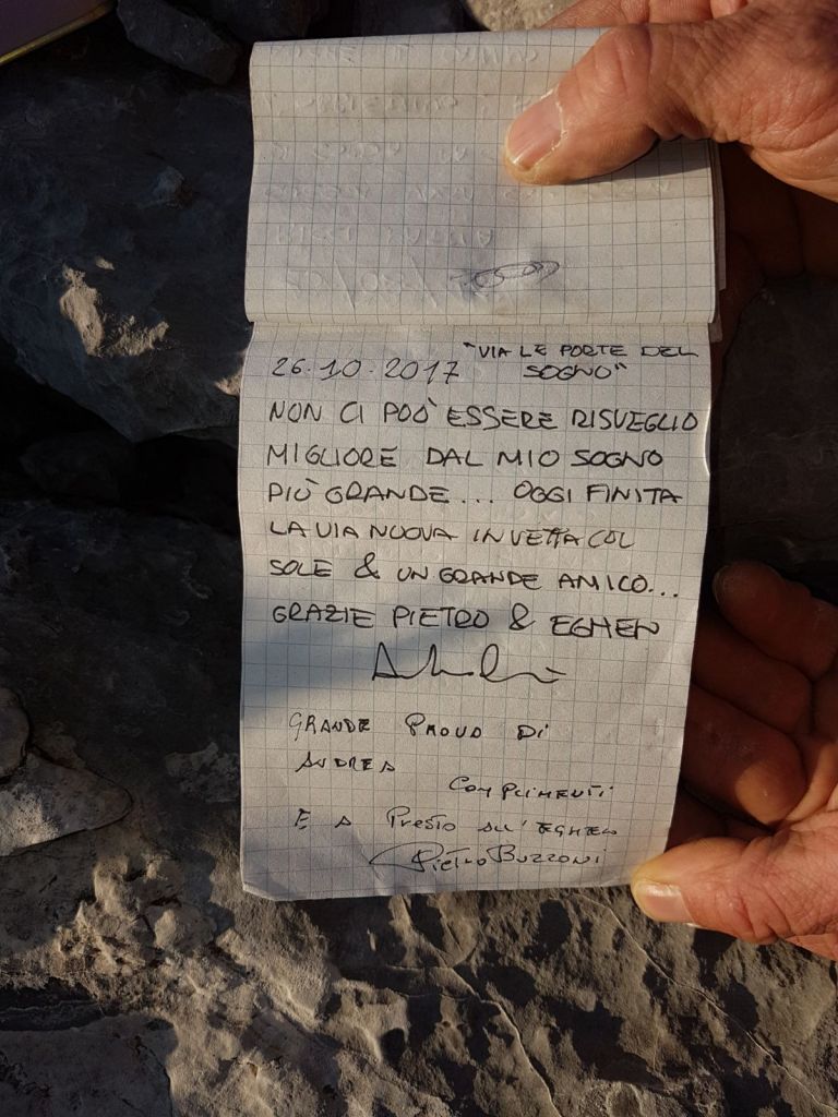 Quel giorno alla base della parete tra i componenti del team troviamo una delle piรน prolifere e forti cordate valsassinesi, Andrea Spandri e Adriano Selva, che rimangono rapiti da questa parete e con la giusta maturazione tornano ed esprimono al meglio loro stessi nel capolavoro verticale che รจ โPrigionieri dei Sogniโ.