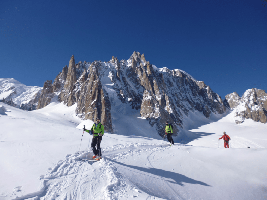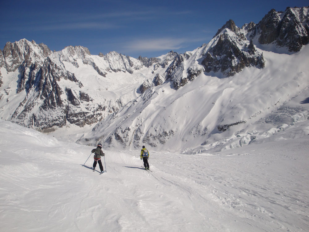 La Vallee Blanche รจ uno stupendo itinerario che permette di visitare gli angoli piรน belli del Monte Bianco tramite una fantastica discesa con gli sci, che si snoda tra ghiacciai e vertiginose guglie granitiche per piรน di 20 km. Percorreremo la famosa Mer de Glace, lo spettacolare ghiacciaio che dal Monte Bianco scende fino a Chamonix. Durante la discesa passeremo sotto le pareti del Grand Capucin, Jorasses, dal Mont Maudit, Aiguilles de Chamonix, pareti che hanno fatto la storia dellโalpinismo. Unโesperienza davvero unica !!!